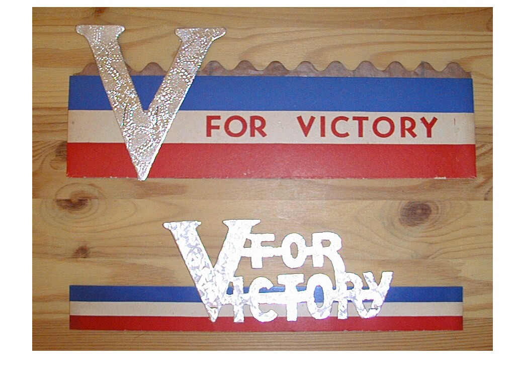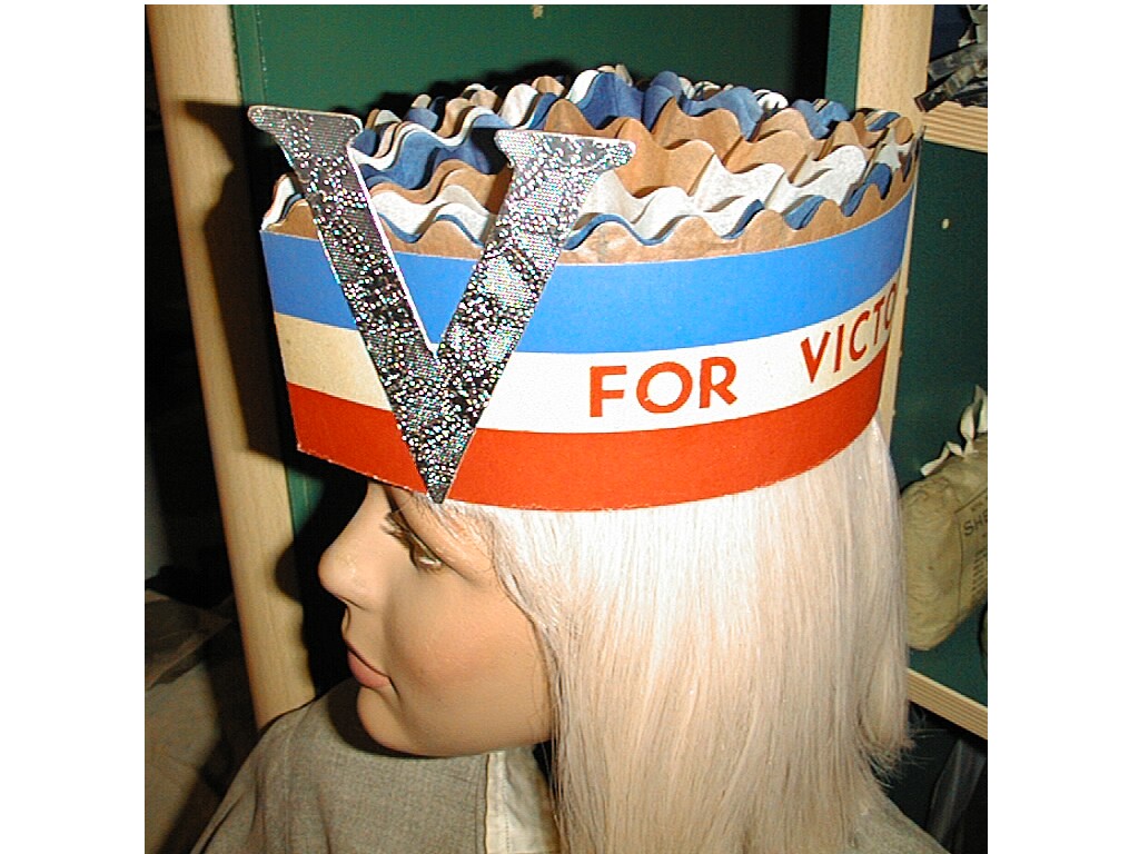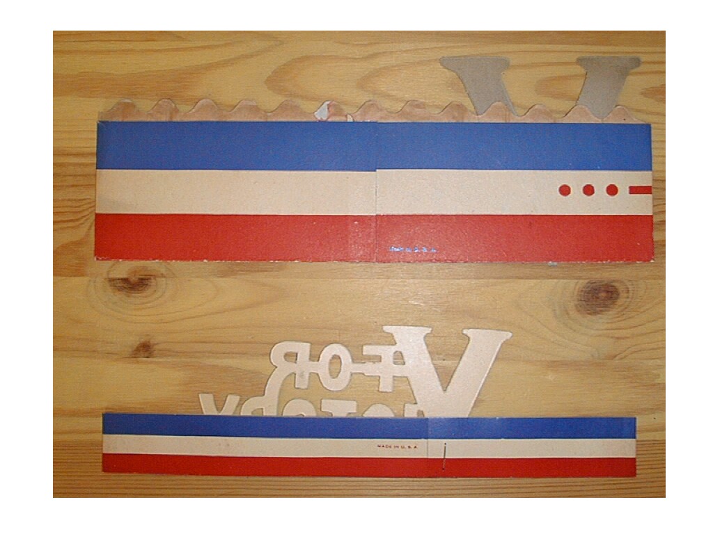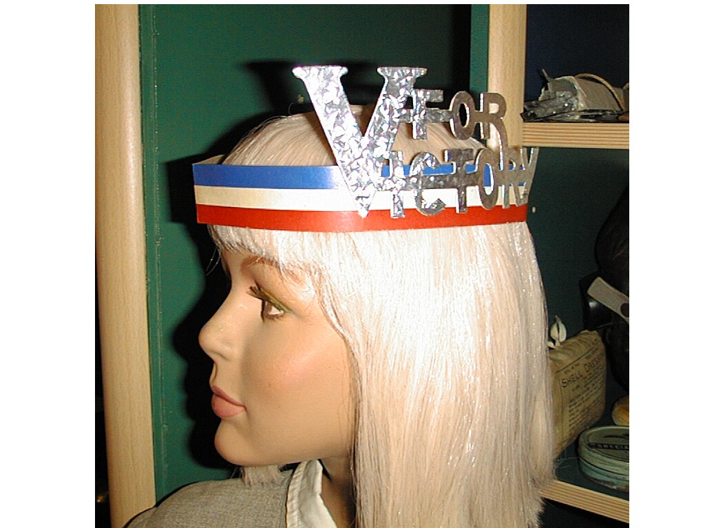 Victory HatsThe union flag hat is made of paper. It measures 38cm along its base and 27.5cm along its sides. The other two are made from a single strip of card stapled together, with a card cut-out of the victory The 'V'hat card strip has a total length of 58.5cm and is 7.5cm in height. The 'V'is 11cm in height The 'V For Victory' hat has a total length of 54cm and is 3cm in width. The logo is 7.5cm in height Detailed pictures of the V hat and V for victory hat.
